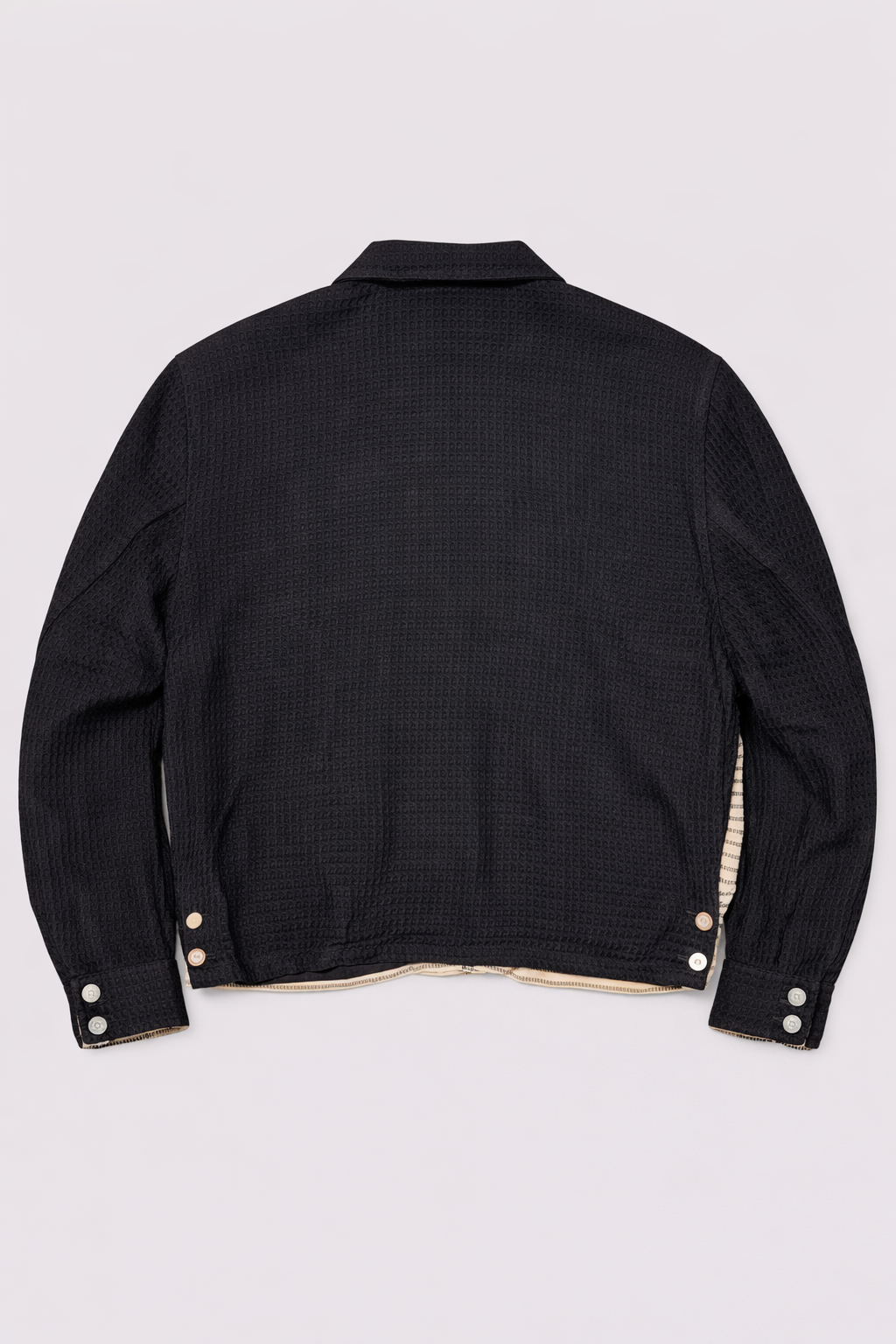 - Black waffle-knit sleeves and shawl collar